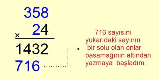 Bu adımda ikinci çarpanın onlar basamağı olan 2 ile birinci çarpan olan 358 sayısını çarparız. Elde ettiğimiz 716 sayısının önceki bulduğumuz sonucun (1432) altına bir basamak sola kaydırılarak yazarız.