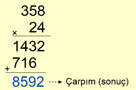 Örneğin 358×24 çarpma işlemini yukarıdaki adımlara göre çarpalım.