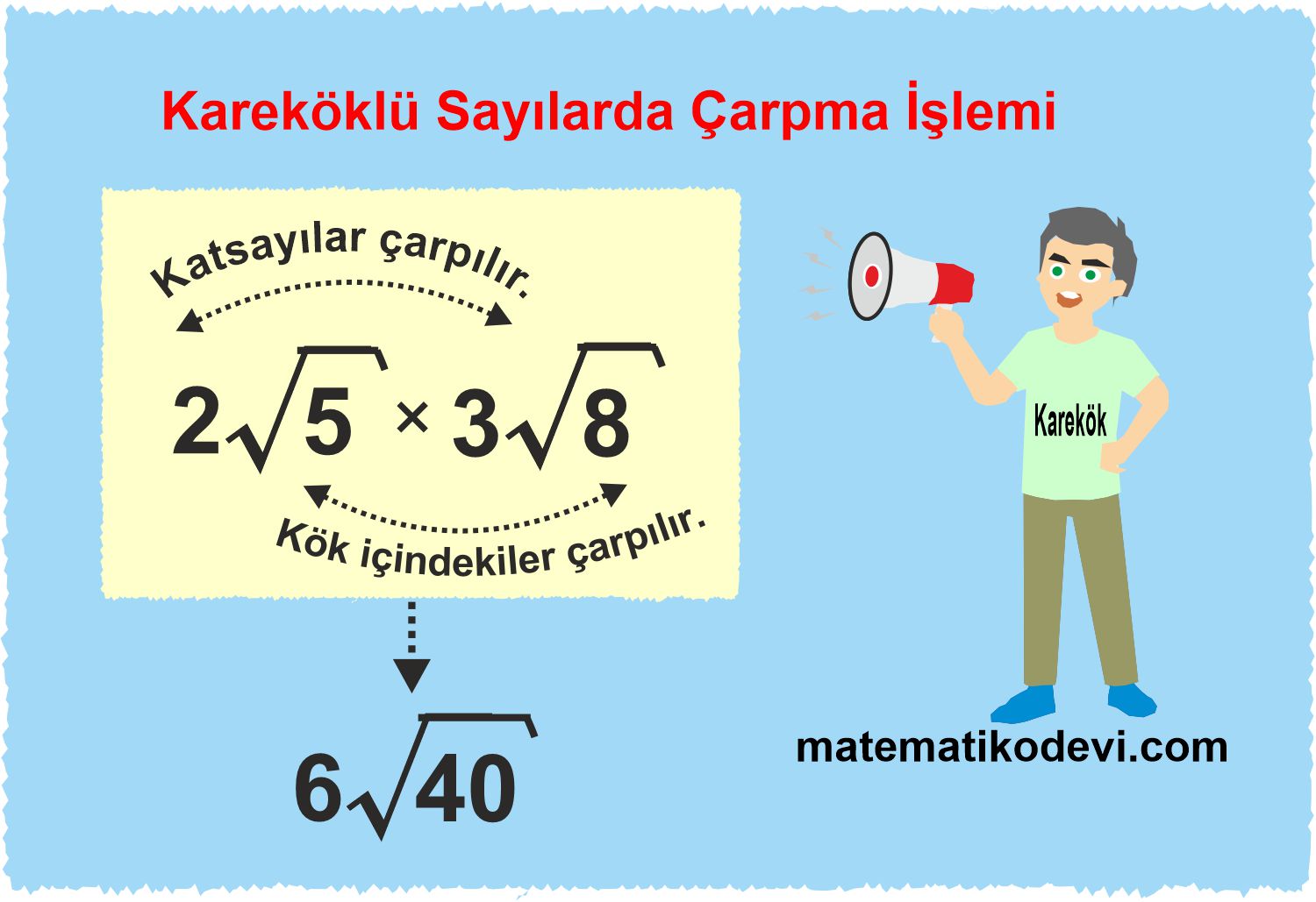 Bilgi: Kareköklü sayılarla çarpma işlemi yapılırken varsa katsayılar çarpılır katsayı olarak yazılır. Kök içindeki sayılar çarpılır kök içinde yazılır.