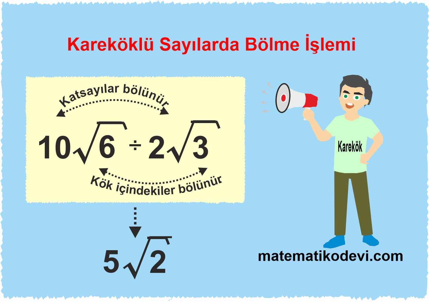 Bilgi: Kareköklü sayılarda bölme işlemi yapılırken katsayılar bölünür katsayı kısmına , karekök içindeki sayılar bölünüp kök içine yazılır.