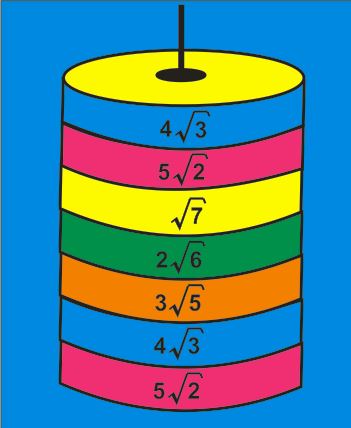 Üzerinde kareköklü sayılar yazılı olan 5 farklı renkteki diskler görseldeki gibi sırayla üst üste konularak 30 katlı yapı oluşturulmuştur. Bu yapı oluşturulurken 13.kattaki olması gereken disk unutulup sonrasında diğer katlar sırasına göre devam etmiştir.