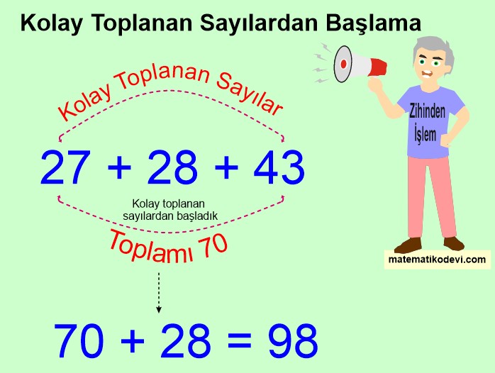 Örneğin; 34 + 23 + 46 işlemini kolay toplanan sayılardan başlayarak zihinden yapalım.